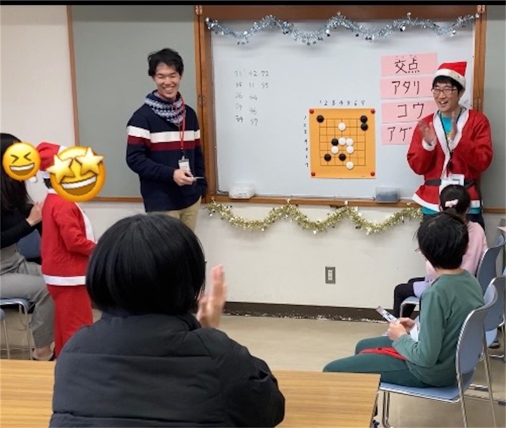 12月は「クリスマススペシャル」!囲碁を打つだけではなく、みんなでクリスマスソングを歌ったり、ビンゴ大会をやったり、サンタからプレゼントがあったりと、あっという間に時間が過ぎるイベントを実施しています。
