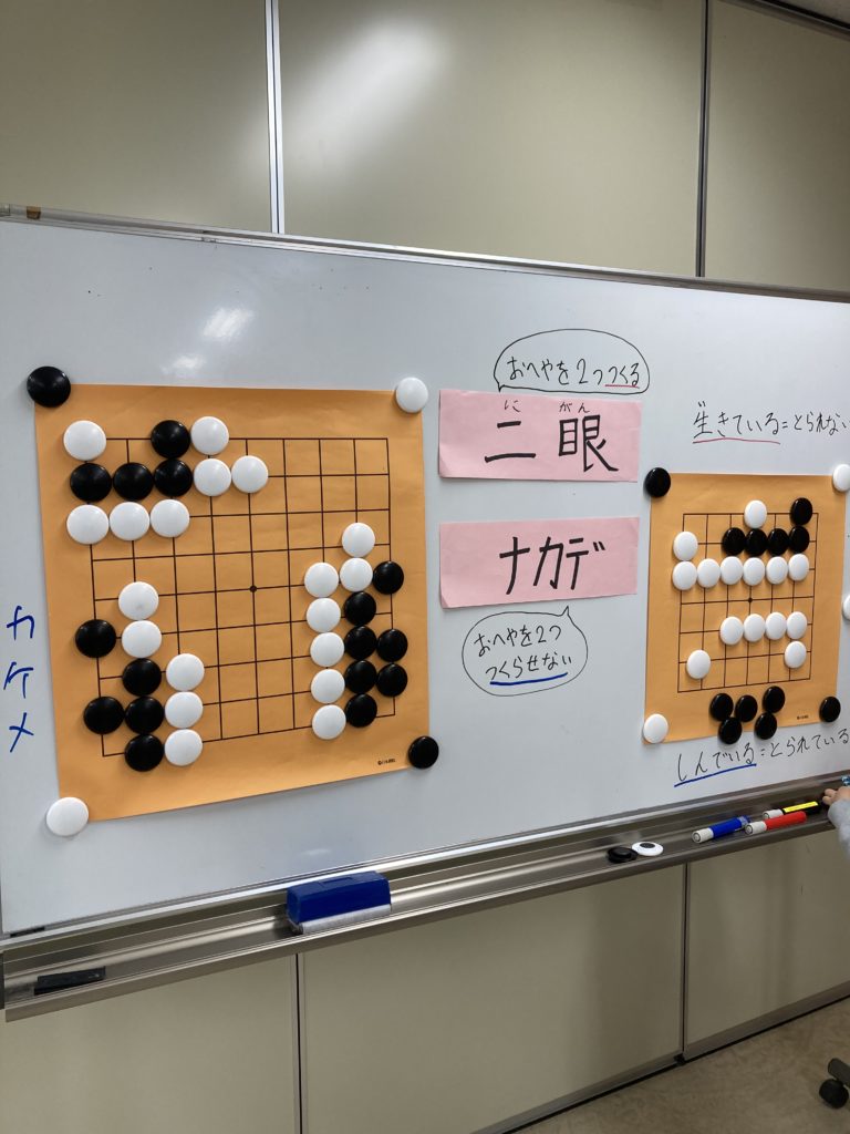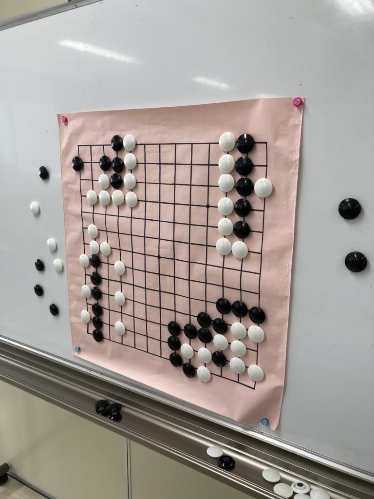 今回の大盤解説では、囲碁が久しぶりの子やはじめたての子もいたので、囲碁の基本「死活」をやりました。囲碁では生きている石や死んでいる石を見極めることがとても大切ですが、慣れないとそれが難しいのです。